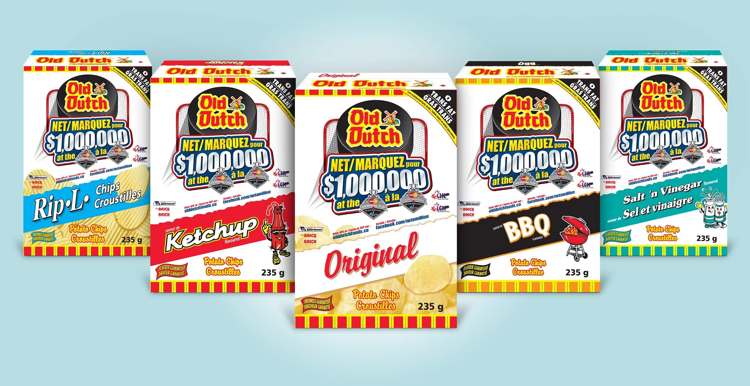 Old Dutch Foods held a contest where participants could win a million dollars. Using the clients supplied packaging files the Net a Million campaign was added to five flavours of the Old Dutch packaging.