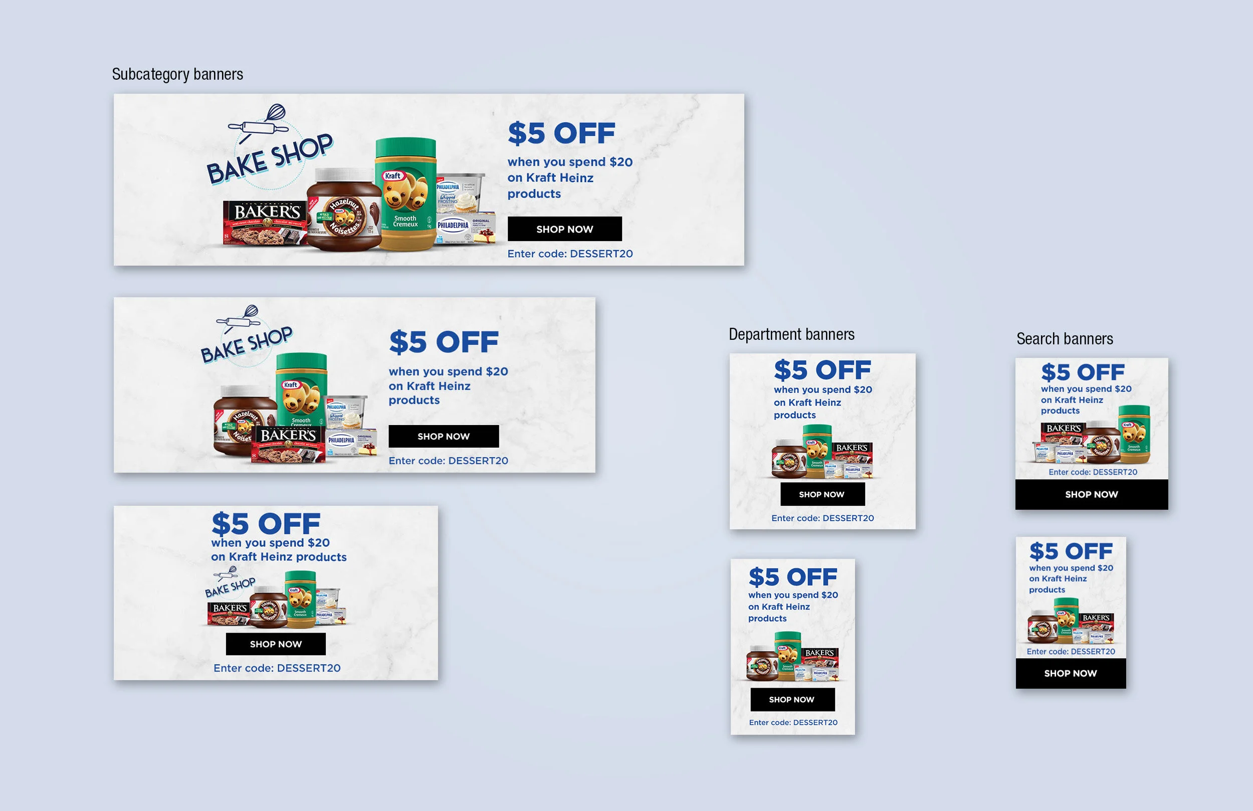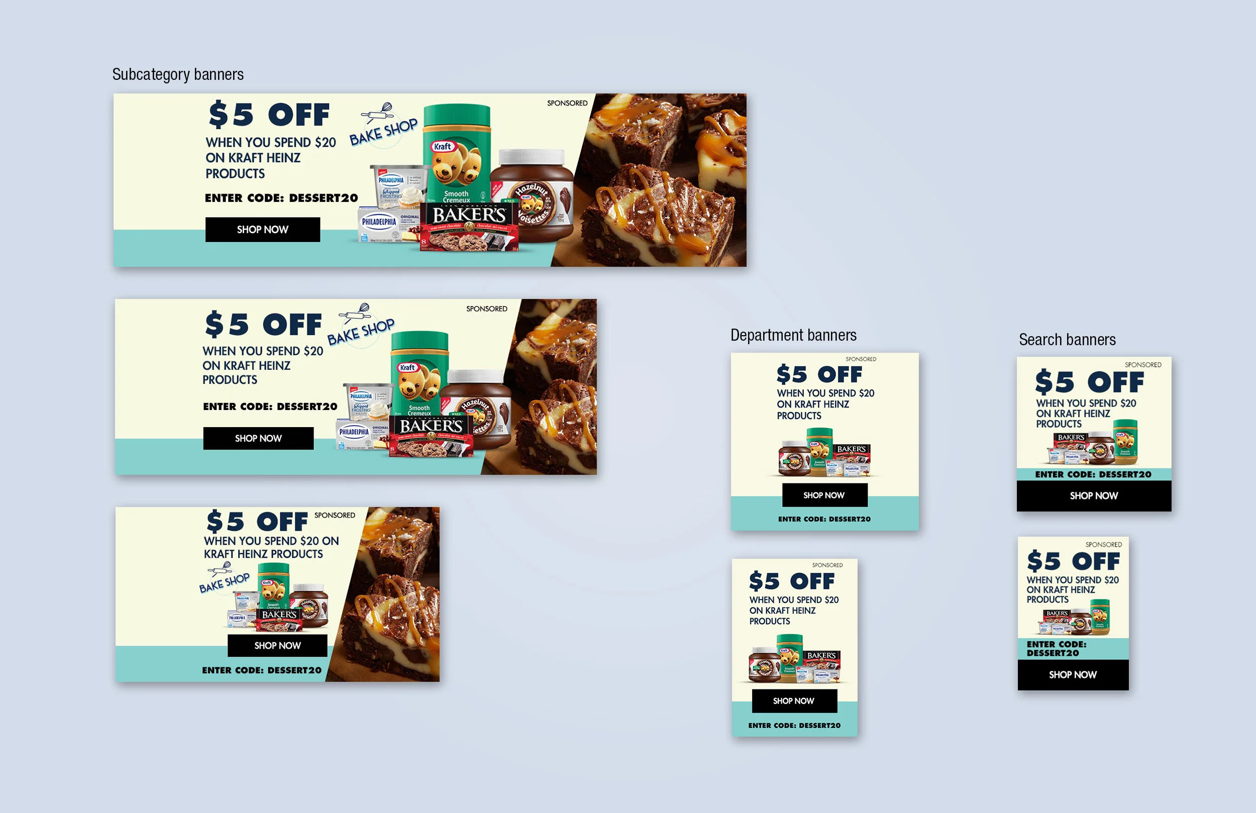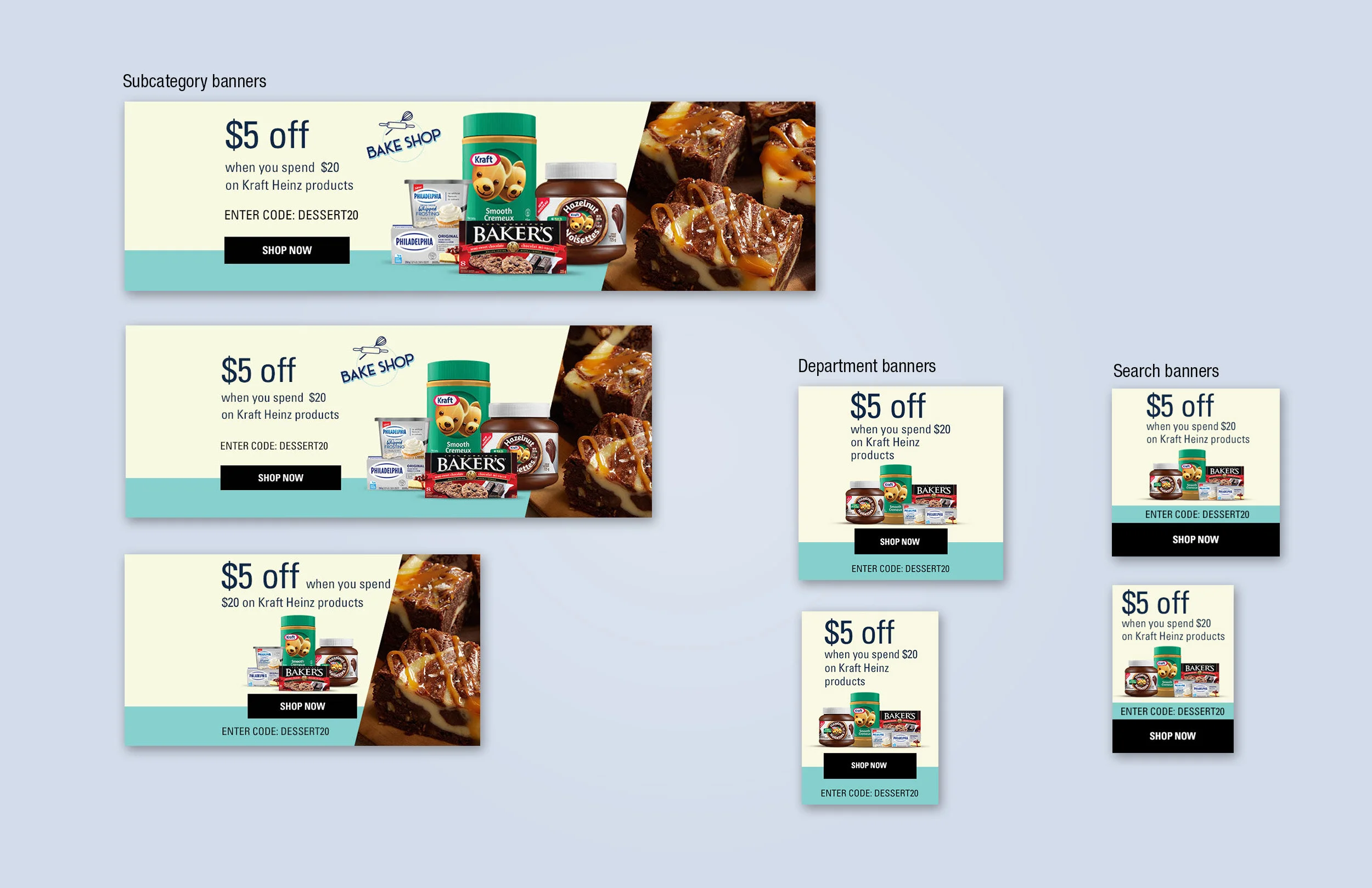 Kraft digital ads were designed for the Click and Collect program. There were multiple digital vendor sites within the program requiring multiple ad sizes for each vendor. The ad designs were not the same for all vendors but vary based on the each site’s requirements. Some layouts were custom designed for the program while others required following the vendors brand, including typeface size, colours, background colour and the call-to-action button locations.