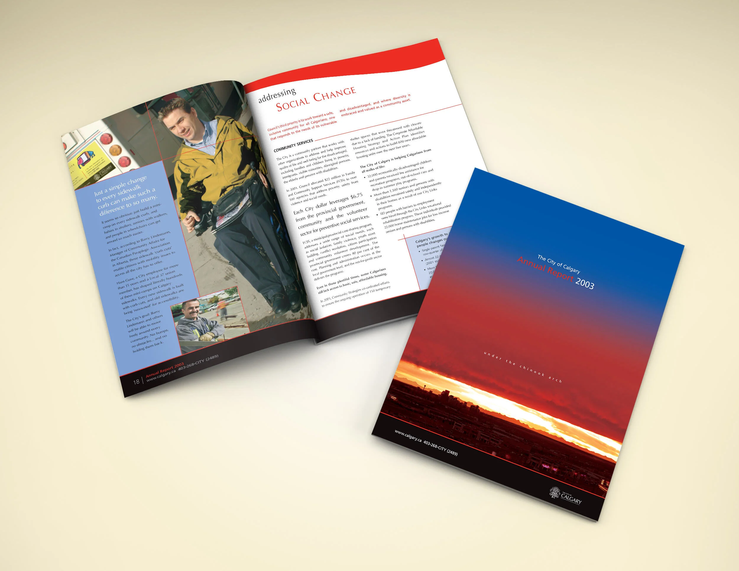 The City of Calgary 80-page annual report, featuring a panoramic chinook arch on the outside and inside cover spread. I suggested the contents highlight the year’s successes by the City and its employees. This direction was positively met with various departments supplying the success stories told by the people responsible for the achievement.