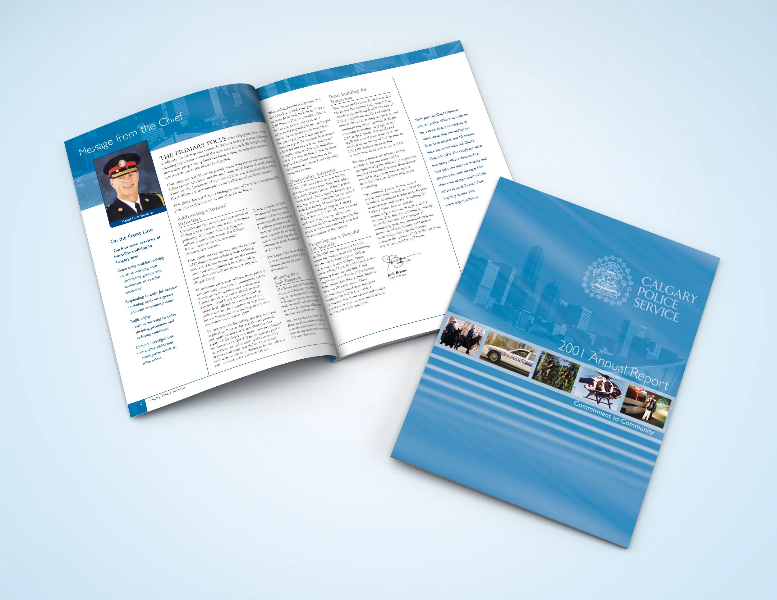 A 20-page annual report for the City of Calgary police department. Historically the report was built internally, for this year the CPS wanted a more professional design. The client requested a cover design and a few spreads so they could finish the layout themselves. When presented with the layout the client requested the project be completed as they did not have the skill set to continue. Each year the police annuals across the country are entered in a design award program; this annual won second place.