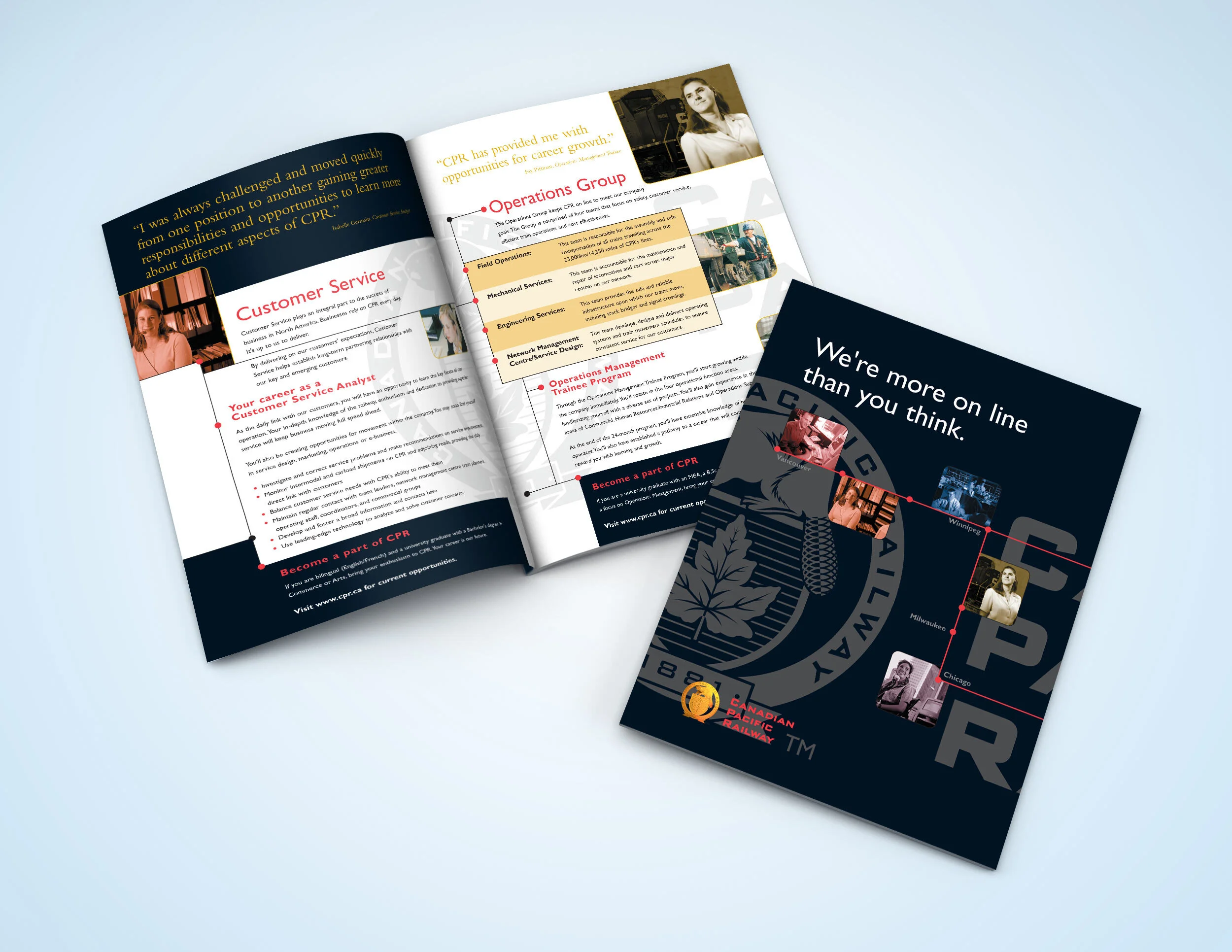 The Canadian Pacific Railway had a reputation as being a place of old men in powder blue suits and engineers in striped bib overalls. The company’s self image required improvement. A 12-page recruitment brochure was requested for a younger demographic. The focus was to portray the CPR as fun, diverse and modern, with all the innovative and technological occupations existing in other companies. The client liked the brochure so much they designed the rest of the trade show display based on the brochure.
