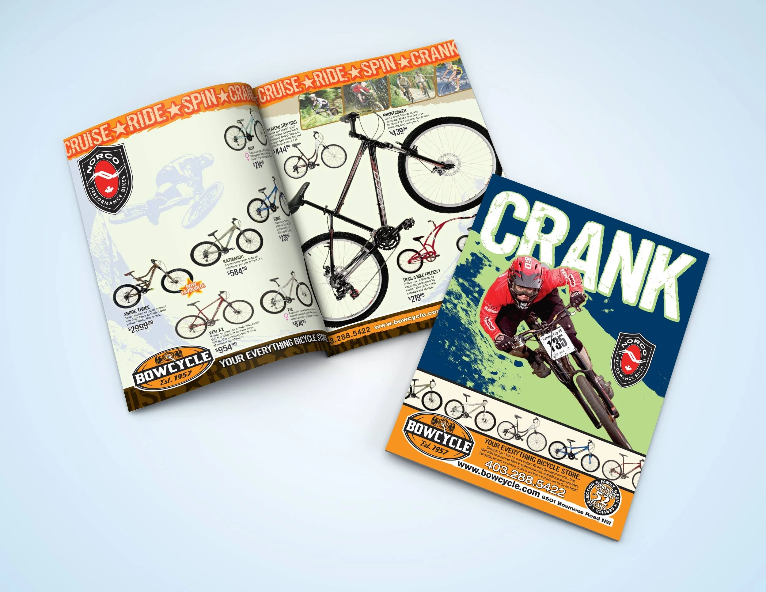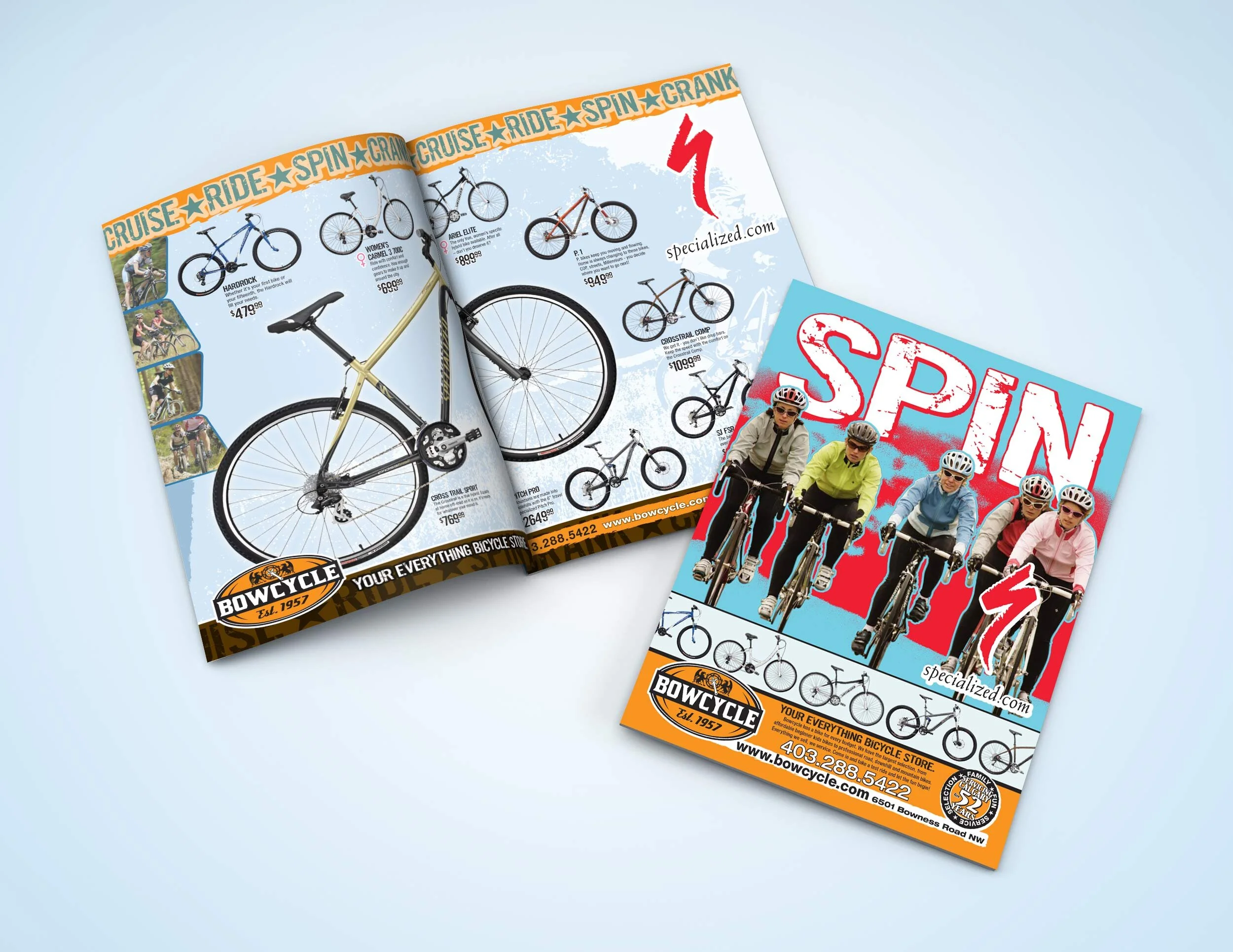 The Bow Cycle bicycle shop annually put out a 16-page flyer in the Calgary Herald newspaper. After meeting with the client I encouraged them to divide up the flyer and put out four 4-page flyers. This strategy would spread the delivery out over a couple of months instead of a one time delivery. This would extend the exposure over a longer time period and help with any unforeseen problems, such bad weather, during promotion dates. I suggested each flyer target one specific demographic; children, female riders, road riders and downhill riders. The graphic nature of the design differentiated the flyer from all the other current promotions in the newspaper.